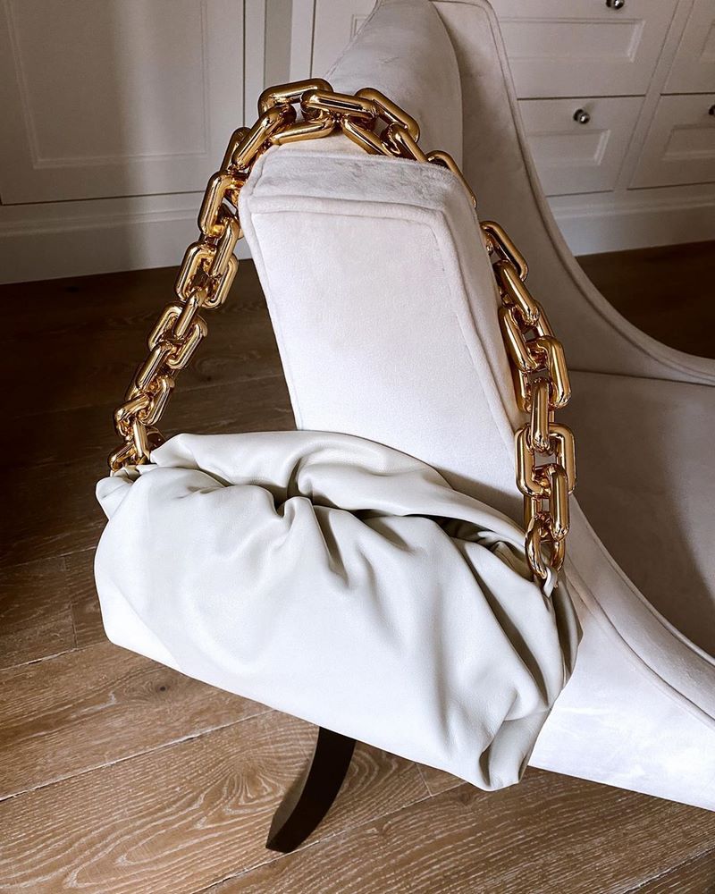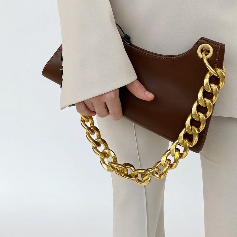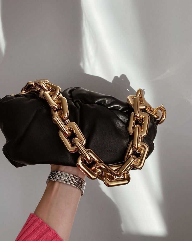 Клатчи и сумочки могут иметь любой дизайн, но цепочки вместо ручек актуальны всегда. Такие модели особенно популярны в неоновых оттенках фасона прямоугольник. Золотые ручки — ход, который до сих пор используют на подиумах, что не удивительно. Модные дома первой величины неоднократно выпускали такие модели и имели оглушительный успех. Золотая цепочка по сей день является классическим вариантом.